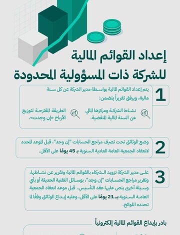 وكشفت الوزارة أنه يتم إعداد القوائم المالية للشركة ذات المسؤولية المحدودة عن كل سنة مالية عن طريق مدير الشركة، الذي يرفق تقريراً، يتضمن نشاط الشركة ومركزها المالي عن السنة المنقضية والطريقة المقترحة لتوزيع الأرباح “إن وجدت”، ووضع الوثائق تحت تصرف مراجع الحسابات “إن وجد” وذلك قبل 45 يوماً على الأقل من الموعد المحدد لانعقاد الجمعية العمومية.