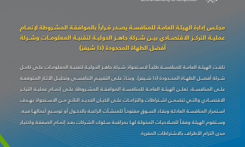 مجلس إدارة الهيئة العامة للمنافسة يصدر قراراً بالموافقة المشروطة لإتمام عملية التركز الاقتصادي بين شركة جاهز الدولية لتقنية نظم المعلومات وشركة أفضل الطهاة المحدودة (ذا شيفز)