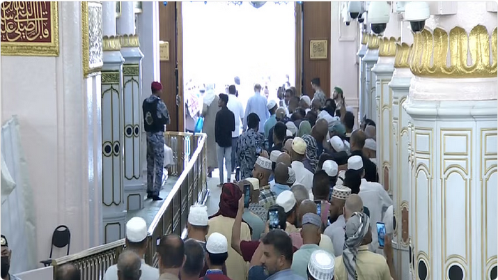 ووثق مقطع فيديو عرضته فناة «الإخبارية»، عبر حسابها على موقع تويتر، للعشرات من المصلين والزائرين الساعين لزيارة الروضة الشريفة.