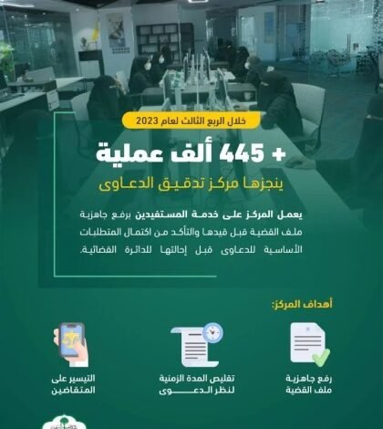 مركز تدقيق الدعاوى بوزارة العدل ينجز 445 ألف عملية