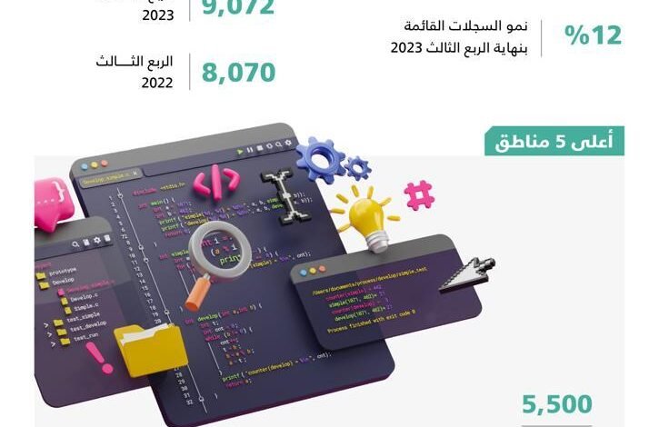 وتضمنت النشرة تفصيلا للسجلات التجارية لنشاط تصميم وبرمجة البرمجيات الخاصة، حيث بلغت 9,072 سجل تجاري بنهاية الربع الثالث 2023، مقارنة مع 8,070 سجل تجاري بنهاية الربع المماثل من العام 2022.