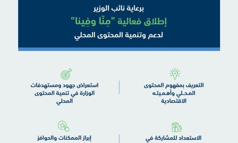 وتضمنت فعالية “منا وفينا”، التعريف بمفهوم المحتوى المحلي ومسارات العمل المُقرة من هيئة المحتوى المحلي والمشتريات الحكومية، واستعرضت أبرز الممكنات والحوافز التي تقدمها الوزارة لتنمية المحتوى المحلي، إضافة إلى مشاركة الأسر المنتجة بهدف دعم المحتوى المحلي في قطاعات الوزارة، بجانب عدد من الأركان حول مفهوم ومسارات عمل المحتوى المحلي بالمملكة، وأبرز المنتجات والمحاصيل الزراعية المساهمة في تنمية المحتوى المحلي.