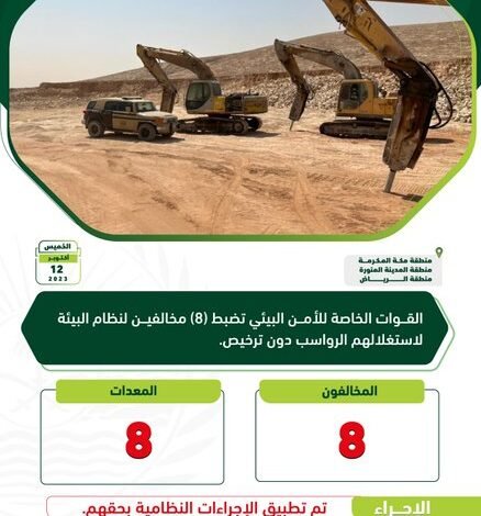 ضبطت القوات الخاصة للأمن البيئي (8) مخالفين لنظام البيئة لاستغلالهم الرواسب دون ترخيص بمناطق مكة المكرمة والمدينة المنورة والرياض.