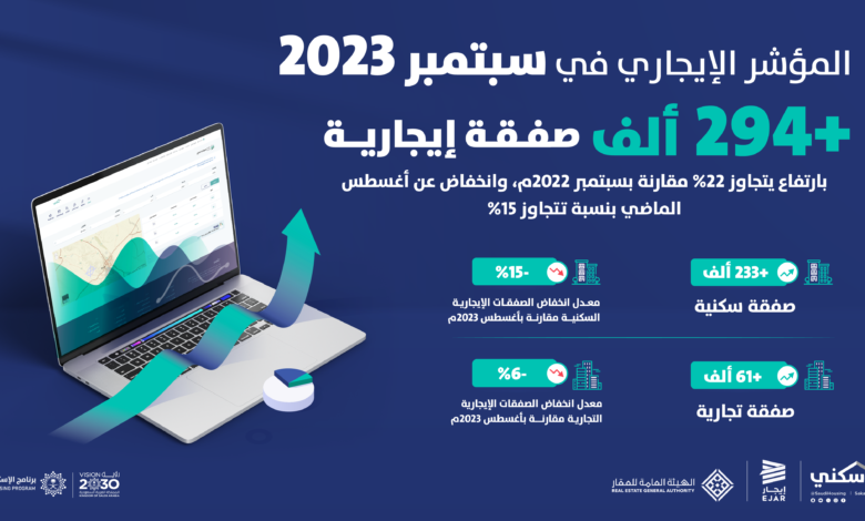 سجّل “المؤشر الإيجاري” أكثر من 294 ألف صفقة إيجارية سكنية وتجارية خلال شهر سبتمبر الماضي، وذلك ضمن التقارير والبيانات التي تصدرها الشبكة الإلكترونية لخدمات الإيجار “إيجار” بالتكامل مع منصة سكني؛ إذ يتضمن المؤشر أكثر من 160 مدينة ومحافظة تشمل معظم مدن ومناطق المملكة بارتفاع يتجاوز 22% مقارنة بشهر سبتمبر 2022، وانخفاض عن أغسطس الماضي بنسبة تتجاوز 15%.