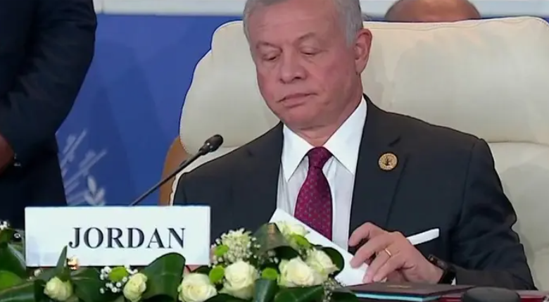 قال العاهل الأردني في كلمته بالجلسة الافتتاحية لقمة السلام بالقاهرة إنه لا يمكن القبول بسياسة العقاب الجماعي ضد سكان غزة وما يحدث جريمة حرب.