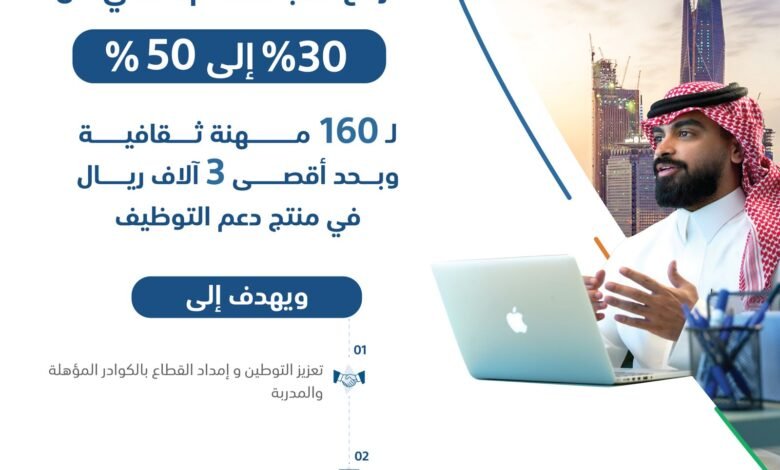أعلن صندوق تنمية الموارد البشرية وبالتعاون مع وزارة الثقافة؛ عن رفع نسبة الدعم المالي في منتج دعم التوظيف من 30 في المائة إلى 50 في المائة وبحد أقصى 3 آلاف ريال، وذلك في 160 مهنة ثقافية في 286 نشاطاً؛ لتعزيز الاستدامة المهنية وتحقيق الاستقرار الوظيفي في قطاع العمل الثقافي.