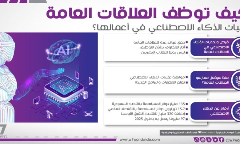 وسلّط التقرير -الذي أعدته W7Worldwide للاستشارات الاستراتيجية والإعلامية، والذي حمل عنوان: “العلاقات العامة في عصر الذكاء الاصطناعي”- الضوء على: كيفية تغيير الذكاء الاصطناعي لصناعة العلاقات العامة، والمزايا والفرص التي يوفرها لهذه الصناعة، والتحديات التي أوجدها، واستخدام ممارسي العلاقات العامة لتطبيقات الذكاء الاصطناعي، وكيف تسهم في تحقيق مستهدفات رؤية المملكة 2030 في مجال الاقتصاد الرقمي.