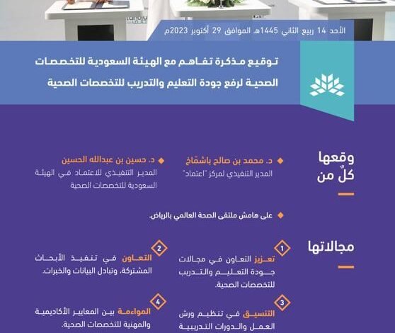 وقعت هيئة تقويم التعليم والتدريب -ممثلة في المركز الوطني للتقويم والاعتماد الأكاديمي “اعتماد”, مذكرة تفاهم مع الهيئة السعودية للتخصصات الصحية لتعزيز التعاون في مجالات جودة التعليم والتدريب للتخصصات الصحية، وذلك على هامش ملتقى الصحة العالمي في واجهة روشن للمعارض والمؤتمرات بالرياض، الذي يعقد خلال الفترة من 29 – 31 أكتوبر 2023م.