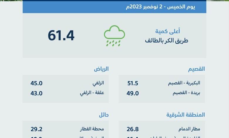سجّلت منطقة مكة المكرمة أعلى معدلٍ لكميات هطول الأمطار أمس الأربعاء؛ حيث بلغت (61.4) ملم في طريق الكر بالطائف، و(22.5) ملم في مطار الطائف.