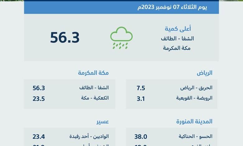 وأوضح التقريرٍ اليومي لوزارة البيئة والمياه والزراعة, لرصد كميات هطول الأمطار في مناطق المملكة، أن المحطات رصدت هطول أمطار في مناطق: (الرياض، مكة المكرمة، المدينة المنورة، القصيم، عسير، حائل، جازان، الباحة، الجوف) وذلك بكميات تفاوتت بين 56.3 ملم و0.6 ملم، وذلك من الساعة التاسعة صباح الاثنين 6 نوفمبر حتى الساعة التاسعة صباح الثلاثاء 7 نوفمبر 2023م – (24 ساعة).