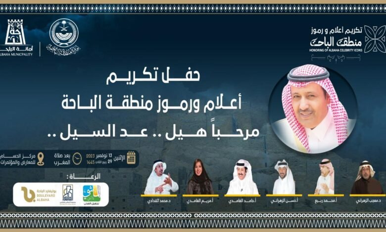 برعاية صاحب السمو الملكي الأمير الدكتور حسام بن سعود بن عبدالعزيز آل سعود، أمير منطقة الباحة، تنظم أمانة الباحة، يوم غدٍ الاثنين 29 ربيع الآخر 1445هـ، الموافق 13 نوفمبر 2023م، في قاعة الحسام للمؤتمرات والمعارض، حفل تكريم لستة من رموز وأعلام منطقة الباحة ممثلين في: