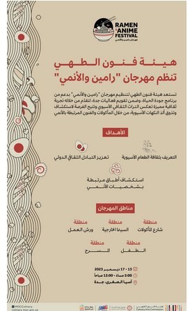 تُطلق هيئة فنون الطهي الأربعاء المقبل، مهرجان “رامين والأنمي” في منطقة آسيا الصغرى بمدينة جدة بدعمٍ من برنامج جودة الحياة – أحد برامج تحقيق رؤية المملكة 2030-؛ الذي يعكس التراث الثقافي والفني عبر تسليط الضوء على فنون الطهي المرتبطة بالأنمي التي لها تأثير قوي لدى المجتمع؛ ليمنح الزوّار فرصة ثمينة في استكشاف وتذوق أشهى النكهات من مختلف الدول الآسيوية، وذلك ضمن تقويم فعاليات جدة لعام 2023.