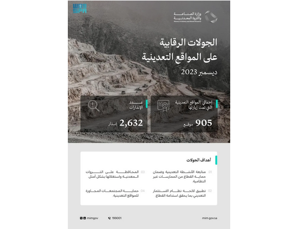 نفّذت وزارة الصناعة والثروة المعدنية -ممثلة بوكالة الامتثال والرقابة التعدينية-، 905 جولات رقابية على عددٍ من المواقع التعدينية في مختلف مناطق المملكة خلال شهر ديسمبر الماضي، أصدرت خلالها 2632 إنذاراً على المُنشآت المخالفة لنظام الاستثمار التعديني.