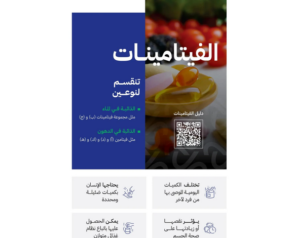 وتختلف الكميات الموصى بها للفرد في اليوم من الفيتامينات بحسب حالته وفئته (رجال، نساء، حوامل، مرضعات، أطفال)، ويساعد “دليل الفيتامينات”الصادر من الهيئة العامة للغذاء والدواء في معرفة دورها في جسم الإنسان، ومصادرها، وكمية الاحتياج لها، وذلك من خلال الرابط التالي: https://www.sfda.gov.sa/ar/awarenessarticle/87862 .