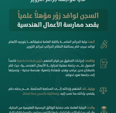 النيابة العامة: السجن لمدة سنة لوافد عربي زور مؤهلا علميا لممارسة الأعمال الهندسية