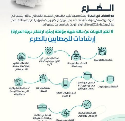 وأضاف: تتضمّن الإرشاداتُ المقدمة للمصابين بالصرع أخذَ الدواء والالتزام به، والتحدث مع الطبيب عند وجود أسئلة، واستشارة الطبيب قبل تناول أدوية أو مكملات أخرى، واتباع نظام غذائي متوازن، والمحافظة على وزن صحي، والاحتفاظ بسجل النوبات، والحصول على قسط كافٍ من النوم “7 – 8” ساعات على الأقلّ، وعدم إغلاق باب الغرفة أو الحمام، وتقليل التوتر قدر الإمكان، وتجنب الإصابات الرياضية التي يمكن أن تزيد من خطر النوبات، وعدم استخدام التبغ أو تعاطي موادّ أخرى، والتعرف على مسبّبات النوبات مثل الضوء الساطع والوامض وتجنبها قدر المستطاع، وتغطية أي حواف أو زوايا أثاث حادّة أو بارزة في المنزل.