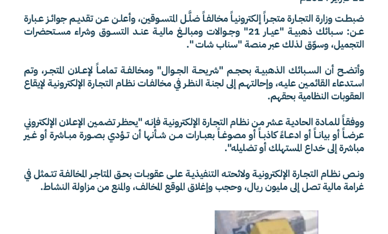 ضبطت وزارة التجارة متجراً إلكترونياً مخالفاً ضلَّل المتسوقين، وأعلن عن تقديم جوائز عبارة عن: سبائك ذهبية “عيار 21” وجوالات ومبالغ مالية عند التسوق وشراء مستحضرات التجميل، وسوّق لذلك عبر منصة “سناب شات”.