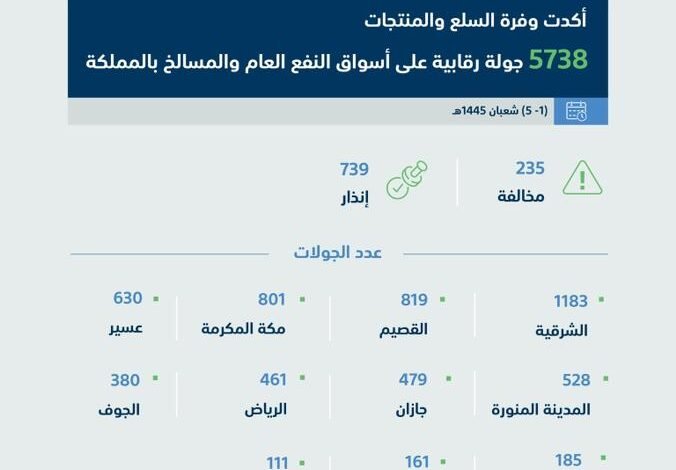 وأوضحت الوزارة، أن الفرق الفنية الميدانية، نفّذت خلال خمسة أيام جولات تفتيشية ورقابية في معظم مدن ومحافظات المملكة المختلفة بلغت (5738) جولة رقابية، رصدت خلالها (235) مخالفةً وأصدرت (739) إنذارًا، مؤكدةً إحالة المخالفين للجهات ذات العلاقة لاتخاذ الإجراءات النظامية بحقهم.