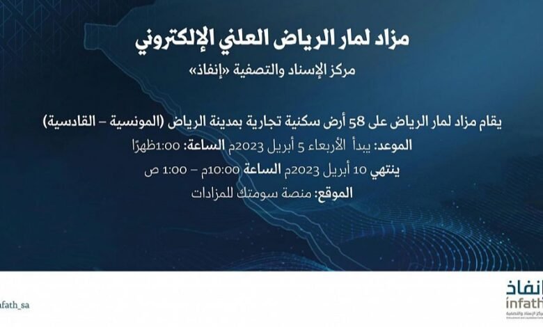 أعلن مركز الاسناد والتصفية “إنفاذ” عن مزاد لمار الرياض العلني الإلكتروني لعرض 58 أرضاً تجارية سكنية بمدينة الرياض في كل من حي المونسية والقادسية، وذلك يوم الأربعاء 5 أبريل حتى 10 أبريل 2023م.