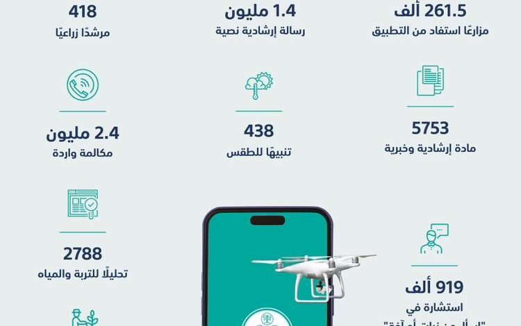 وأفاد التقرير أن التطبيق يقدم عددًا من الخدمات الإلكترونية، من ضمنها معرفة أسعار السلع والخدمات في (24) سوقًا للنفع العام التي يغطيها التطبيق لمعرفة الأسعار، حيث استقبل خلال العام الماضي(1.384.810) مكالمةً واردةً، وقدم (2.375.985) رسالة إرشادية نصية، ونحو (919.088) استشارة في قسم “اسأل عن نبات أو آفة”، و(438) تنبيهًا للطقس، وتم نشر (5753) مادة إرشادية وخبرية في التطبيق، بجانب بث (355) حلقة إرشادية مباشرة.