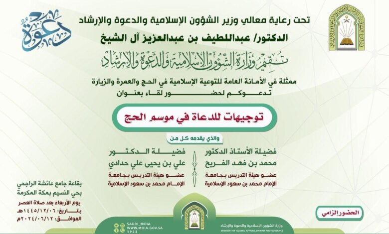 تحت رعاية معالي وزير الشؤون الإسلامية والدعوة والإرشاد الشيخ الدكتور عبداللطيف بن عبدالعزيز آل الشيخ، تنظم الوزارة ممثلة بالأمانة العامة للتوعية الإسلامية في الحج والعمرة والزيارة، اليوم الأربعاء السادس من شهر ذي الحجة الجاري، ندوة علمية بعنوان: (توجيهات للدعاة في موسم الحج) يقدمها عضوي هيئة التدريس بجامعة الإمام محمد بن سعود الإسلامية الدكتور محمد بن فهد الفريح، والدكتور علي بن يحيى حدادي.