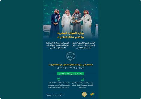 وبحسب المسؤولين، فإن تطبيق المحاسبة على أساس الاستحقاق سيوفر رؤية شاملة ودقيقة عن الوضع المالي للجهات الحكومية، من خلال توفير معلومات كاملة عن الأصول والالتزامات والإيرادات والمصروفات، بما يُسهم في اتخاذ قرارات أكثر استنارة وتحسين عمليات التخطيط والرقابة المالية. دور وزارة الموارد البشرية في قيادة التحول المحاسبي، جاء فوز وزارة الموارد البشرية والتنمية الاجتماعية بالمركز الأول عن فئة الوزارات في برنامج “رواد الاستحقاق المحاسبي” ليؤكد ريادة الوزارة في تطبيق أفضل الممارسات المحاسبية والمالية في القطاع الحكومي, فقد عملت على إصدار قوائمها المالية الانتقالية للعام 2022 وفق أساس الاستحقاق، مما أسهم في تحسين جودة الحسابات المالية وتعزيز الشفافية.