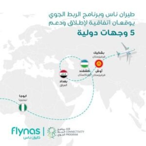أعلن طيران ناس، الناقل الجوي الوطني السعودي والطيران اﻻقتصادي الرائد في الشرق الأوسط، توقيع اتفاقية مع برنامج الربط الجوي لإطلاق خمس وجهات دولية مباشرة إلى عواصم العراق ونيجيريا وأوزبكستان وقيرغيزستان بالإضافة إلى ثاني أكبر مدينة قيرغيزية، لتسهيل وصول الزوار والحجاج والمعتمرين إلى المملكة.