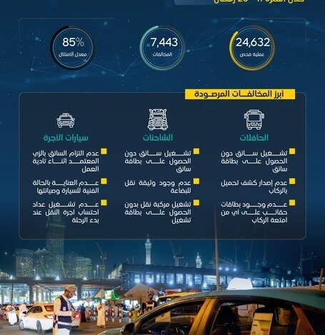 ورصدت الفرق الرقابية أكثر من 7 آلاف مخالفة في مكة المكرمة، من خلال أكثر من 24 ألف عملية فحص ميدانية، وبمعدل امتثال بلغ 85%، وأكثر من 1.1 ألف مخالفة في المدينة المنورة، من خلال أكثر من 10 آلاف عملية فحص ميدانية، وبمعدل امتثال وصل إلى %91، وتنوعت المخالفات ما بين تشغيل سائق حافلة دون الحصول على بطاقة سائق، وتشغيل حافلة دون الحصول على بطاقة تشغيل، وعدم وجود بطاقات حقائب على أي من أمتعة الركاب بالحافلات، فيما تركزت مخالفات الشاحنات على تشغيل المركبة دون الحصول على بطاقة تشغيل، وعدم وجود وثيقة نقل للبضاعة، فيما تركزت مخالفات سيارات الأجرة على عدم العناية بالحالة الفنية للسيارة، وعدم تشغيل عداد احتساب أجرة النقل عند بدء الرحلة، وعدم التزام السائق بالزي المعتمد في أثناء تأدية العمل.