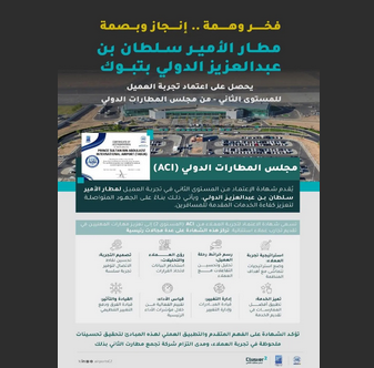 مطار الأمير سلطان بن عبدالعزيز الدولي بتبوك يحصل على شهادة اعتماد تجربة العميل من المستوى الثاني