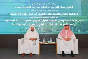 رعى مستشار خادم الحرمين الشريفين سمو الأمير سلطان بن سلمان وبحضور معالي وزير الشؤون الإسلامية والدعوة والإرشاد الشيخ الدكتور عبداللطيف بن عبدالعزيز آل الشيخ حفل تكريم خريجي حلقات تحفيظ القرآن الكريم وتميزوا علميا وفي مسيرتهم المهنية بجامع الأميرة سلطانة بنت تركي السديري رحمها الله بحي القدس بمدينة الرياض الذي أقيم مساء اليوم السبت الرابع والعشرين من شهر رمضان المبارك لعام 1444هـ، وشهده عدد من أصحاب السعادة والفضيلة وجمع غفير من المصلين .