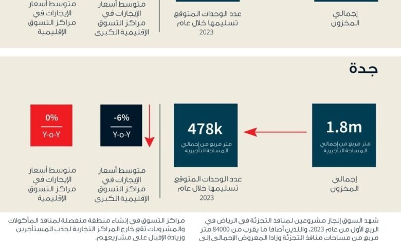 شهد السوق إنجاز مشروعين لمنافذ التجزئة في الرياض في الربع الأول من العام، واللذين أضافا نحو 84 ألف متر مربع من مساحات منافذ التجزئة في العاصمة، وزادا المعروض الإجمالي بها إلى 3.4 ملايين متر مربع. وفي جدة، ارتفع مخزون السوق من منافذ التجزئة بنحو 46 ألف متر مربع ليصل الإجمالي إلى 1.8 ملايين متر مربع. ومن المنتظر أن يشهد السوق، خلال الأشهر التسعة المتبقية من هذا العام، دخول 478 ألف متر مربع في جدة و105 آلاف متر مربع في الرياض. ولكن وفي ظل تراجع أداء سوق المتاجر في جدة، تقتضي الحاجة التحفظ باستمرار بشأن إنجاز المشاريع المستقبلية في الموعد المحدد، مما يشير إلى تباطؤ ظروف السوق في المدينة.