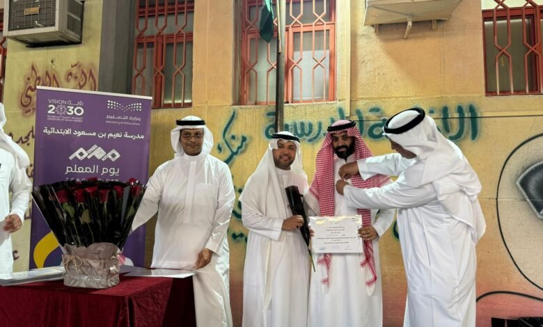 بدوره كرم المساعد للخدمات المساندة المهندس عماد الحربي معلمي مدرسة نعيم بن مسعود الابتدائية وتجول على الفصول الدراسية واطلع على سير العملية التعلمية منوهاً بأثر المعلم ودوره في نفوس طلاب.