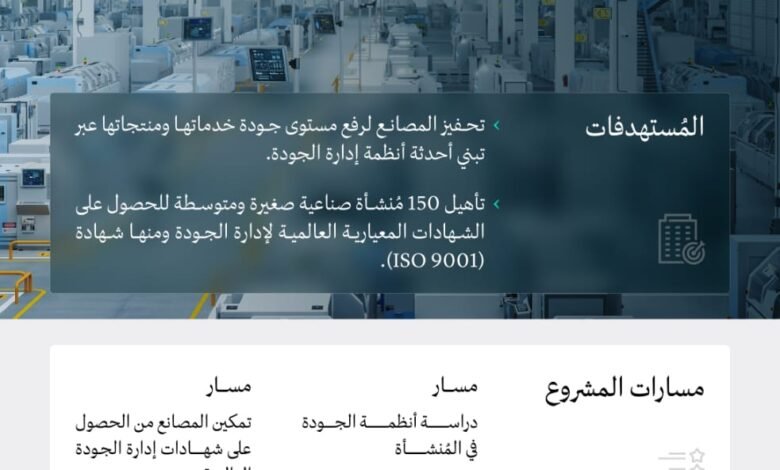 ويعمل المشروع على تحسين أداء المنشآت الصناعية وضمان جودة منتجاتها وخدماتها، من خلال تطبيق أفضل الممارسات الإدارية المؤسسية، وتوفير الدعم الفني والمالي اللازم للمنشآت الصناعية المتوسطة والصغيرة التي تم اختيارها؛ لتمكين تلك المنشآت من الحصول على شهادة إدارة الجودة (ISO 9001)، التي تُعد واحدة من أبرز الشهادات المعيارية العالمية في مجال إدارة الجودة المساهمة في تعزيز كفاءة المنظمة، ورفع قدرتها التنافسية على المستويين المحلي والدولي، ويتطلب الامتثال لمعاييرها وضع نظام إداري للجودة، وتصميم إجراءات وعمليات موثقة، ومراقبة وتقييم الأداء وتحسينه بشكل مستمر؛ لتلبية احتياجات العملاء وتحسين الخدمات بشكل مستمر.