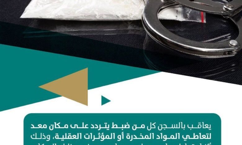 وأوضحت أنه يعاقب بالسجن كل من ضبط يتردد على مكان معد لتعاطي المواد المخدرة أو المؤثرات العقلية، وذلك أثناء تعاطيها مع علمه بما يجري في ذلك المكان وإن لم يثبت تعاطيه.