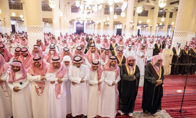 سمو أمير منطقة الرياض وسمو نائبه يؤديان صلاة الميت على الأمير ناصر بن سعود بن ناصر بن فرحان آل سعود وسارة آل الشيخ
