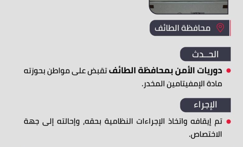 دوريات الأمن بمحافظة الطائف تقبض على شخص بحوزته مادة الإمفيتامين المخدر