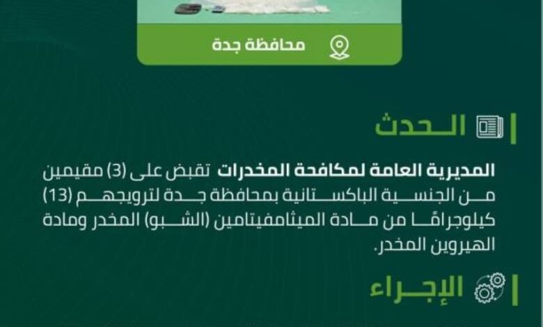 مكافحة المخدرات تقبض على 3 مقيمين بجدة لترويجهم 13 كيلوجرامًا من مادة (الشبو) المخدر