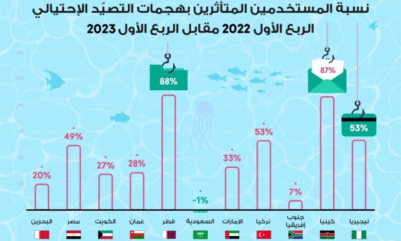 بهدف إلقاء نظرة متعمقة على الهجمات الإلكترونية القائمة على الهندسة الاجتماعية، طرحت كاسبرسكي إحصائيات حول هجمات التصيد الأكثر شيوعاً في منطقة الشرق الأوسط وتركيا وإفريقيا. وعند مقارنة الربع الأول من العام الماضي 2022 بمثيله من العام 2023، فتبين أن مصر شهدت زيادة بنسبة (49%) والإمارات العربية المتحدة (33%) وقطر (88%) وعمان (28%) والكويت (27%) والبحرين (20%) في هجمات التصيد على المستخدمين. ومن ناحية أخرى، سجلت هجمات التصيد في المملكة العربية السعودية انخفاضاً طفيفاً بنسبة 1% في الربع الأول من العام 2023 مقارنة بالفترة نفسها من العام 2022.