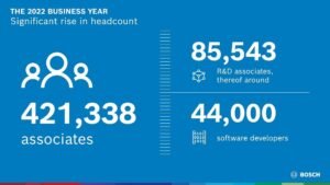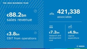 Bosch exceeded its business targets in what was a challenging year. The supplier of technology and services increased its total sales to 88.2 billion euros, following 78.7 billion euros the previous year. This is an increase of 12.0 percent, or an exchange rate-adjusted 9.4 percent. At 3.8 billion euros, EBIT (earnings before interest and taxes) from operations is also higher than the previous-year figure of 3.2 billion euros. The EBIT margin from operations rose from 4.0 to 4.3 percent. Presenting the company’s annual figures, Dr. Stefan Hartung, the chairman of the board of management of Robert Bosch GmbH, said: “We rose well to the challenges of 2022 – both our sales and our margin were higher than expected. And even if the economic and social environment remains demanding, we want to grow significantly faster.”