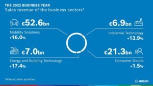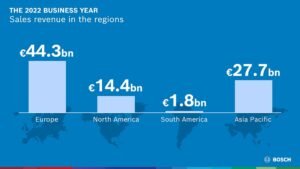 “In all regions, the Bosch Group was able to post a significant increase in sales in 2022 – above all in the Americas,” Forschner said. Sales in North America rose 25.7 percent to 14.4 billion euros. Adjusted for exchange-rate effects, the figure is 12.3 percent. In South America, sales reached 1.8 billion euros. This is an increase of 26.0 percent, or 16.7 percent after adjusting for exchange-rate effects. Sales revenue in Europe was up 7.3 percent year on year, totaling 44.3 billion euros. Adjusted for exchange-rate effects, growth was 9.8 percent. In Asia Pacific (including other regions), sales rose by 12.8 percent to 27.7 billion euros. Adjusted for exchange-rate effects, growth was 7.1 percent.