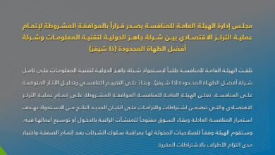 مجلس إدارة الهيئة العامة للمنافسة يصدر قراراً بالموافقة المشروطة لإتمام عملية التركز الاقتصادي بين شركة جاهز الدولية لتقنية نظم المعلومات وشركة أفضل الطهاة المحدودة (ذا شيفز)