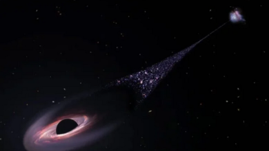 يتدفّق ثقب أسود “ضخم” عبر الفضاء بسرعة قصوى مخلّفاً وراءه سلسلة من النجوم تبعد مئتي ألف سنة ضوئية، على ما…