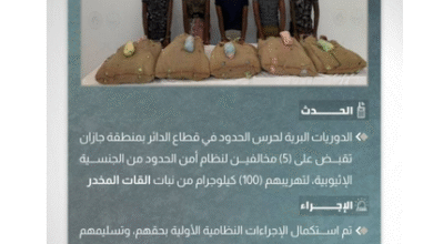 قبضت الدوريات البرية لحرس الحدود في قطاع الدائر بمنطقة جازان على (5) مخالفين لنظام أمن الحدود من الجنسية الإثيوبية، لتهريبهم…