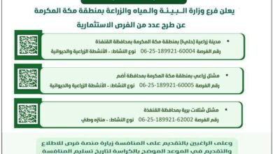 مرفت طيب – مكة المكرمة أو فرع وزارة البيئة والمياه والزراعة بمنطقة مكة المكرمة عن طرح عدد من الفرص…
