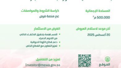 أعلنت وزارة البيئة والمياه والزراعة عن طرح فرصة استثمارية واعدة في قطاع الثروة الحيوانية؛ لإقامة مشروع لتربية وتسمين اللحوم الحمراء،…