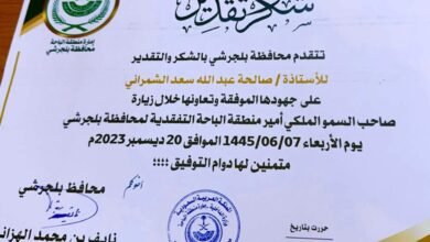 “الشمراني “تتلقى شهادة شكر من محافظ بلجرشي